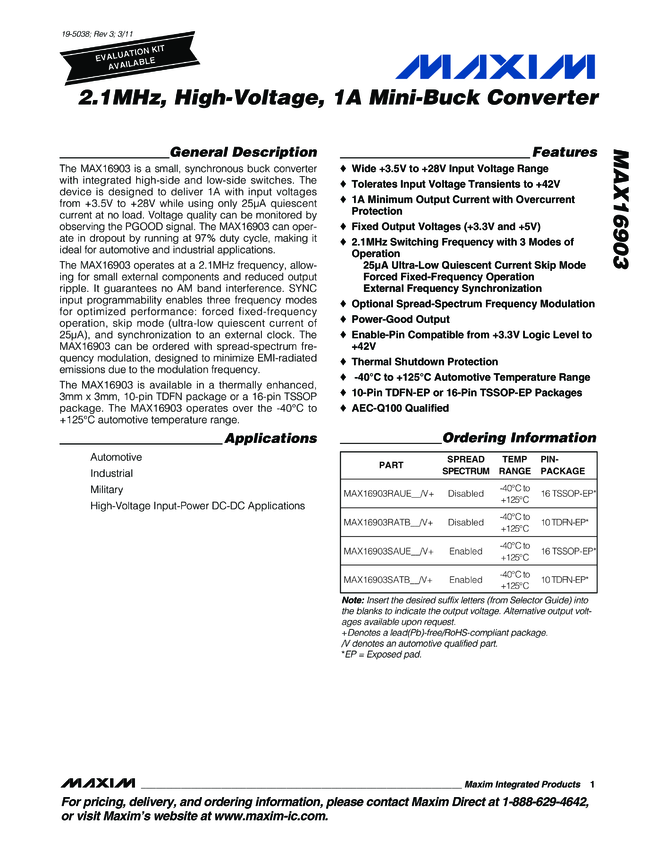 MAX16903 2.1MHz, High-Voltage, 1A Mini-Buck Converter