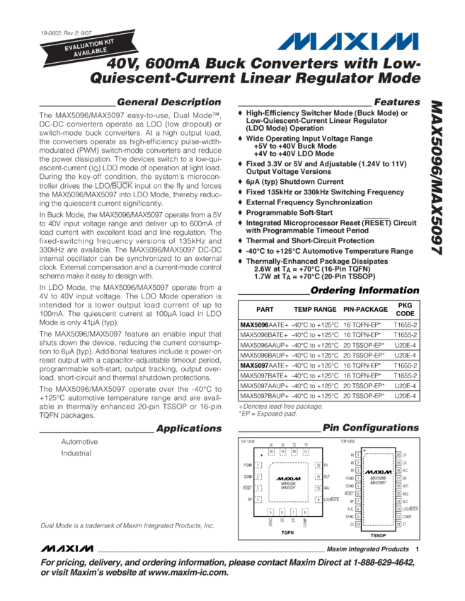 MAX5096, MAX5097 40V, 600mA Buck Converters with Low-Quiescent-Current Linear Regulator Mode