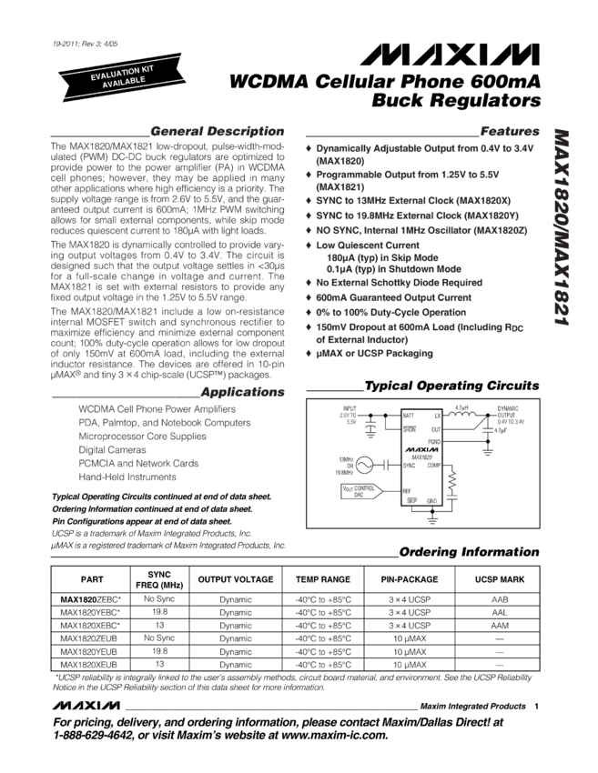 MAX1820, MAX1820Y, MAX1820Z, MAX1821, MAX1821X WCDMA Cellular Phone 600mA Buck Regulators