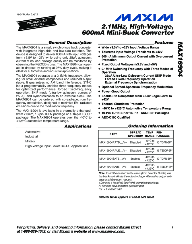MAX16904 2.1MHz, High-Voltage, 600mA Mini-Buck Converter