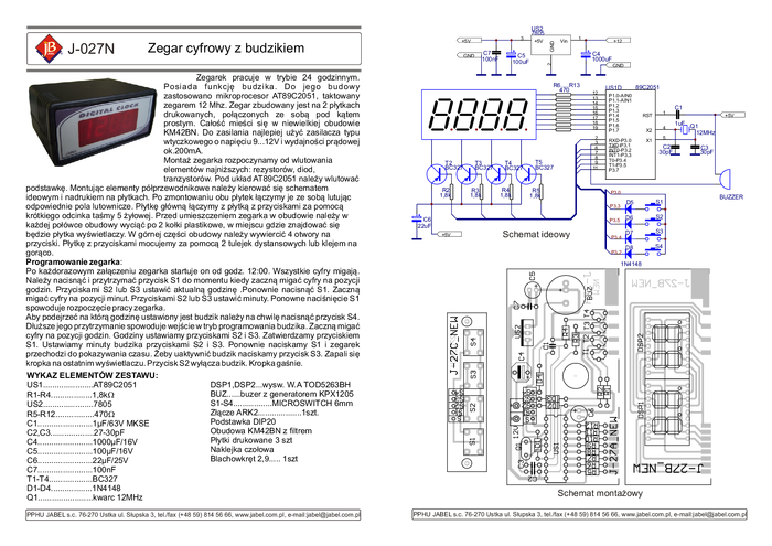 J-027N Mikroprocesorowy zegar cyfrowy z budzikiem zestaw do montażu