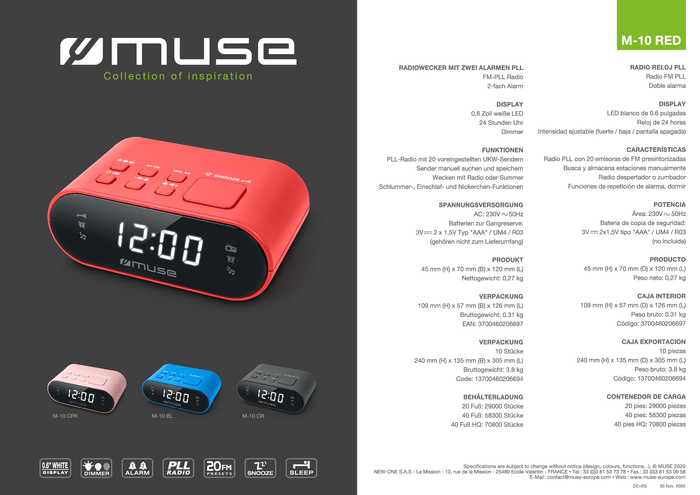 Radiobudzik Muse M-10 RED fale metrowe (VHF), FM funkcja budzika czerwony