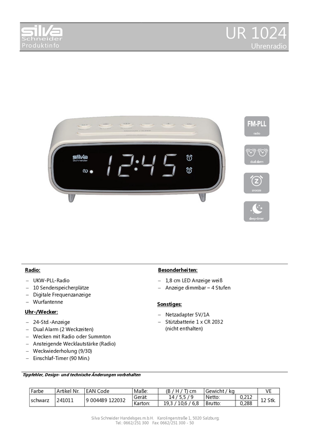 Radiobudzik Silva Schneider UR 1024 fale metrowe (VHF) funkcja budzika czarny