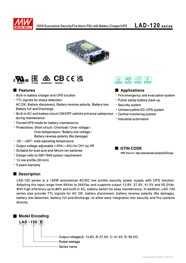 Zasilacz buforowy 120W 13.8V 7.7A, 13.8V 1A LAD-120A