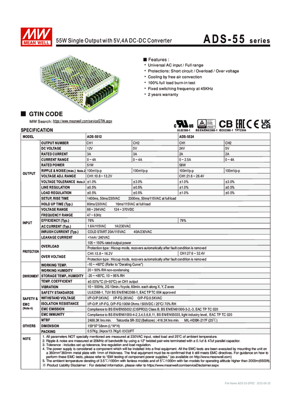 Zasilacz buforowy 55W 12V 4A. 5V 4A ADS-5512