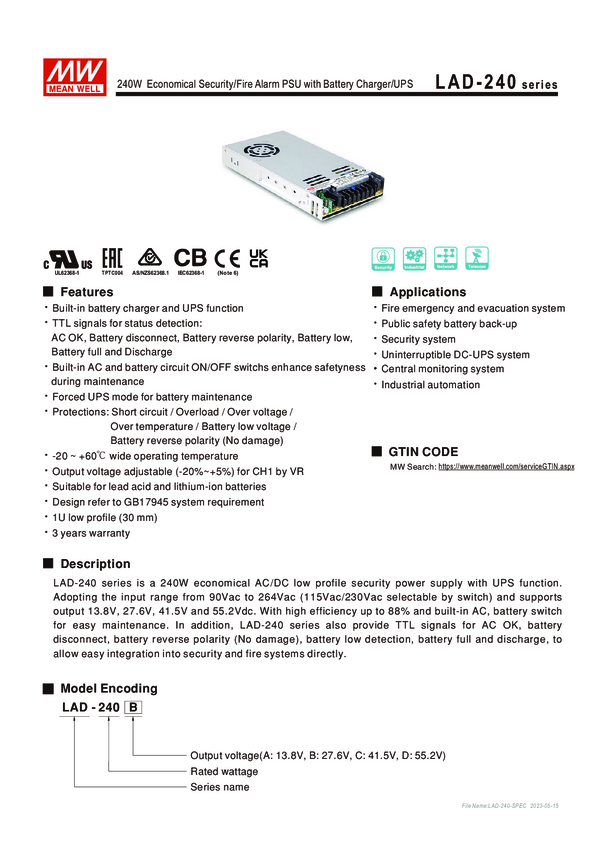 Zasilacz buforowy 240W 13.8V 16.4A, 13.8V 1A LAD-240A