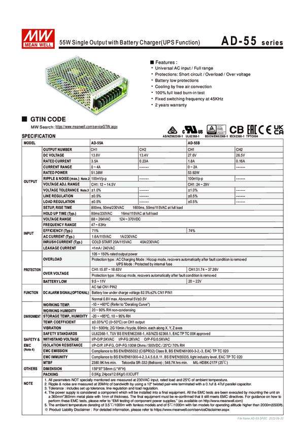 Zasilacz buforowy 55W 13.8V 4A. 13.4V 0.23A AD-55A