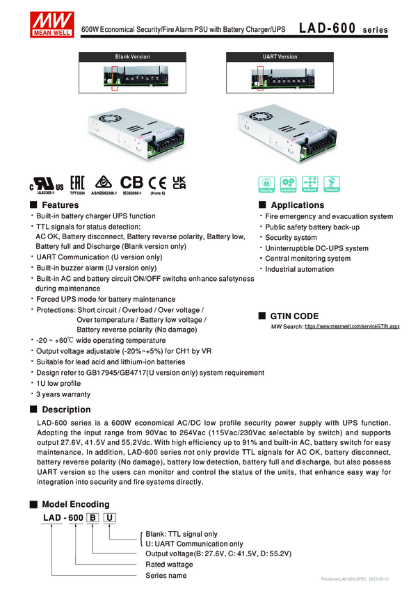 Zasilacz buforowy 600W 27.6V 18.74A, 27.6V 3A LAD-600B