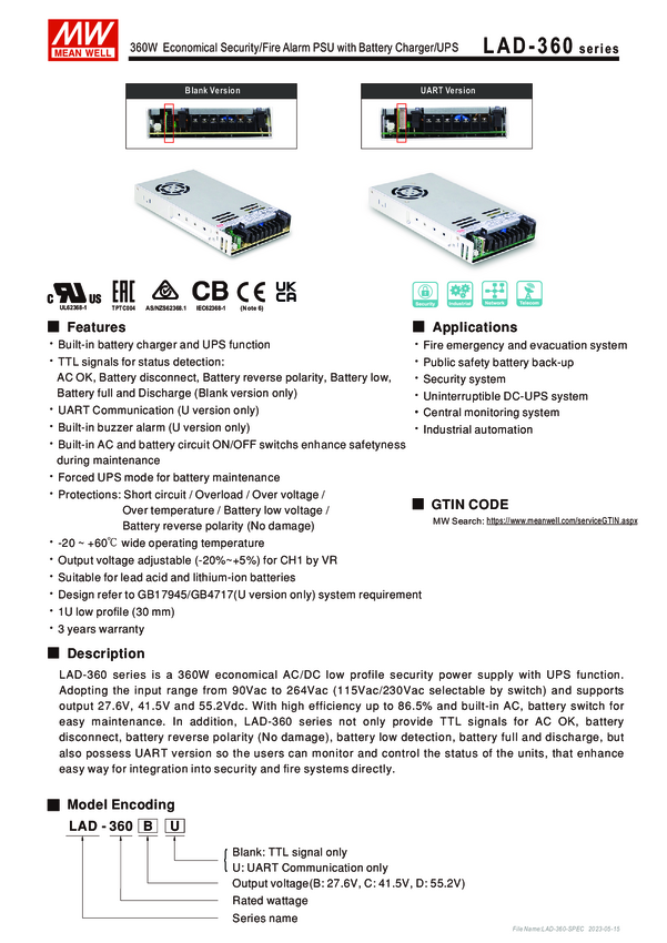 Zasilacz buforowy 360W 27.6V 11.5A, 27.6V 1.5A LAD-360B