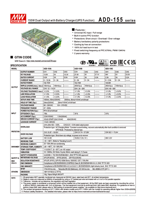 Zasilacz buforowy dwuwyjściowy 155W 27.6V. 5V. 27.1V ADD-155B