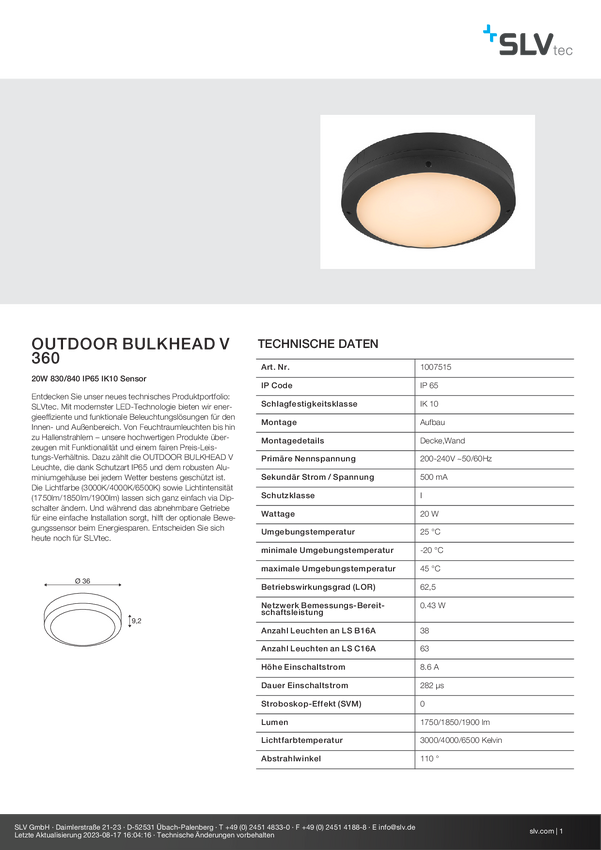 Zewnętrzna lampa ścienna SLV Outdoor Bulkhead V 360 1007515 20 W 1750.00 lm IP65, IK10