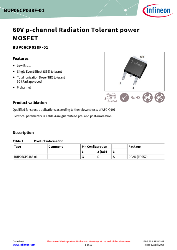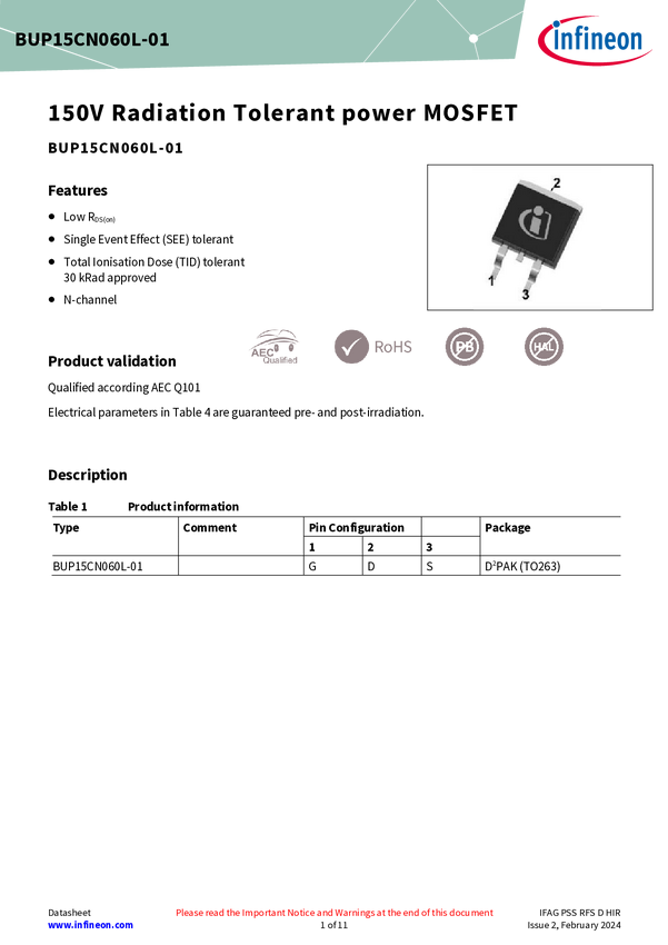 Designed for LEO space applications and constellations Radiation tolerant, 60V, 52A, N-channel MOSFET, PG-TO263, 30krad(Si) TID