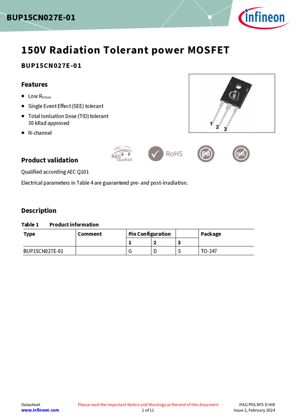 Designed for LEO space applications and constellations Radiation tolerant, 60V, 106A, N-channel MOSFET, PG-TO247, 30krad(Si) TID