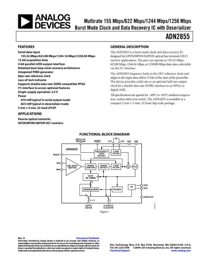ADN2855: Multirate 155 Mbps/622 Mbps/1244 Mbps/1250 Mbps Burst Mode Clock and Data Recovery IC with Deserializer