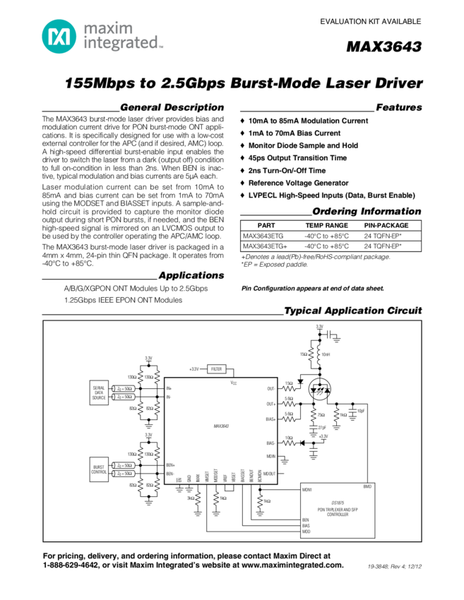 MAX3643 155Mbps to 2.5Gbps Burst-Mode Laser Driver