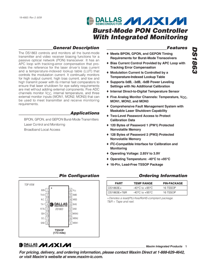 DS1863 Burst-Mode PON Controller With Integrated Monitoring
