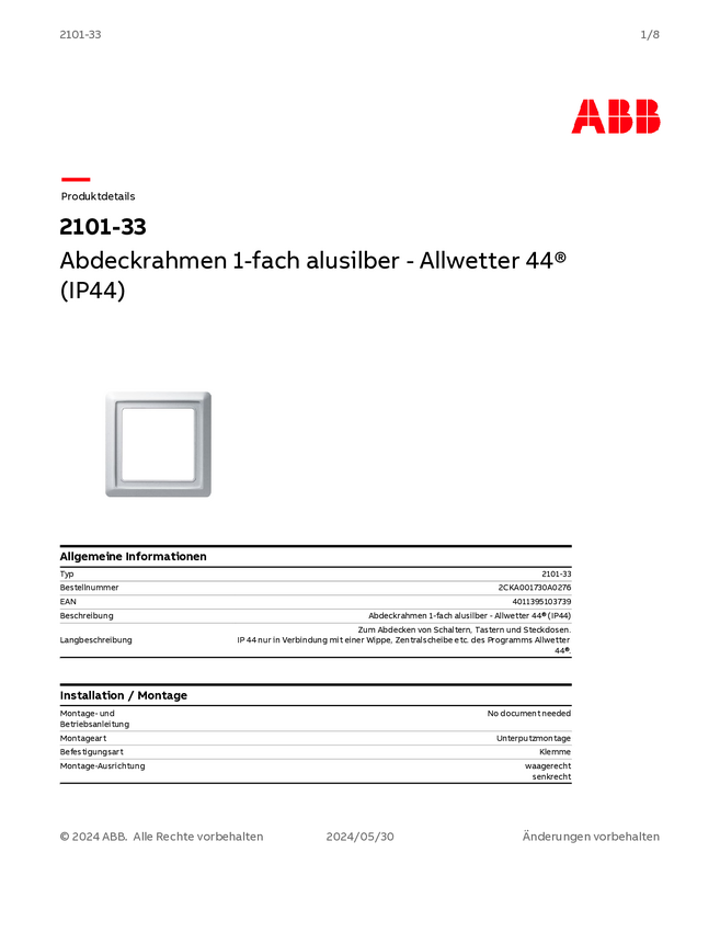 Busch-Jaeger 1 x Ramka Ramka Odporny na warunki atmosferyczne 44 (IP44) aluminium (ral 9006), aluminiowy 2CKA001730A0276