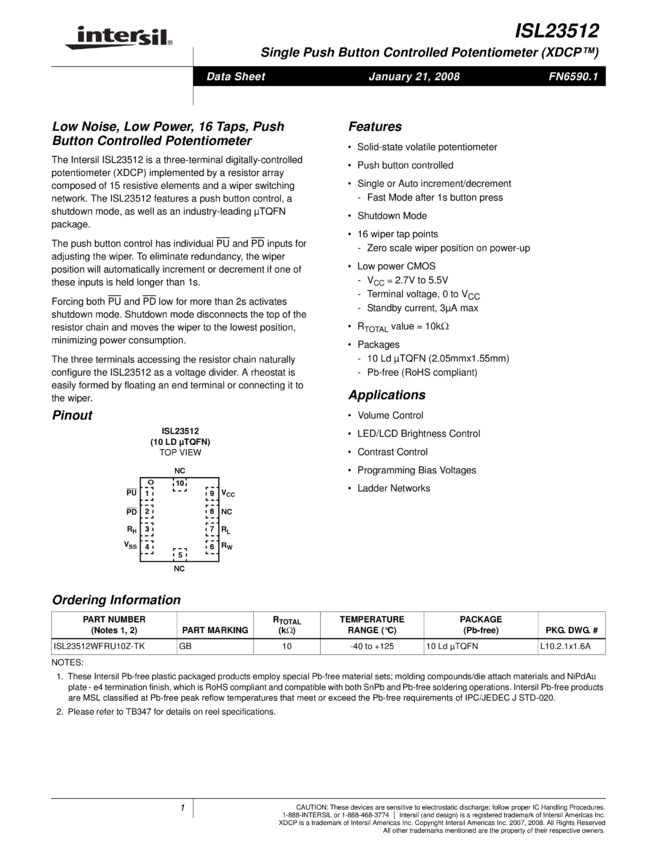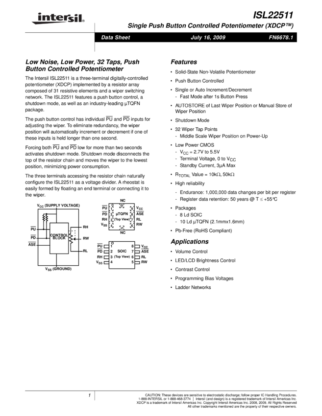 Single Push Button Controlled Potentiometer (XDCP™), Low Noise, Low Power, 16 Taps, PushButton Controlled Potentiometer