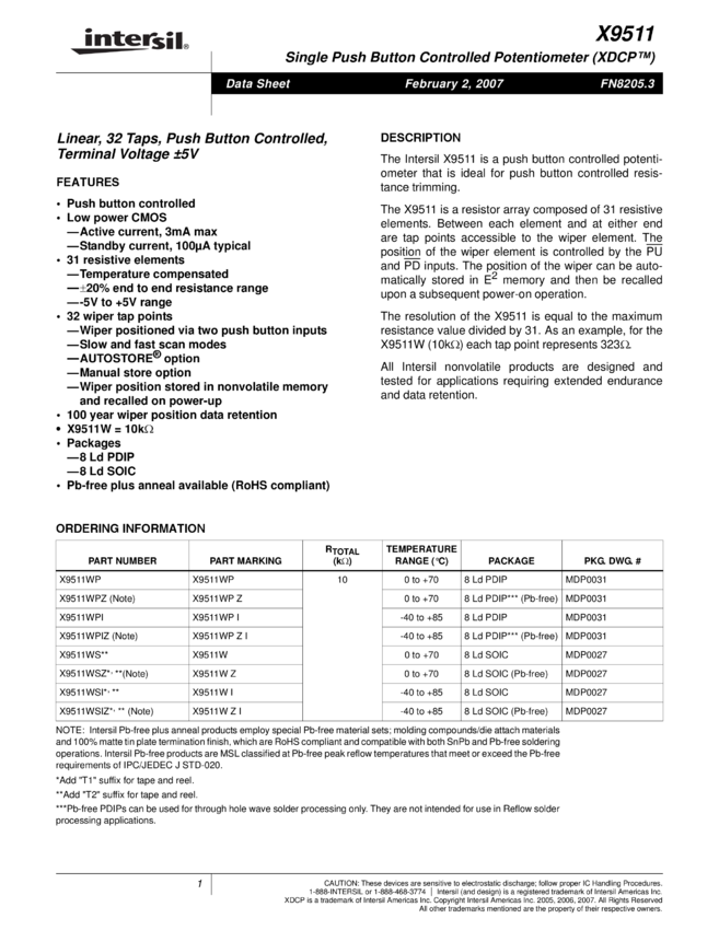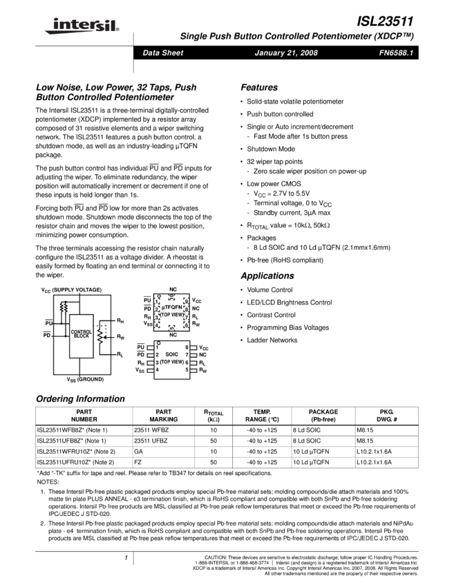 Single Push Button Controlled Potentiometer (XDCP™), Low Noise, Low Power, 32 Taps, PushButton Controlled Potentiometer