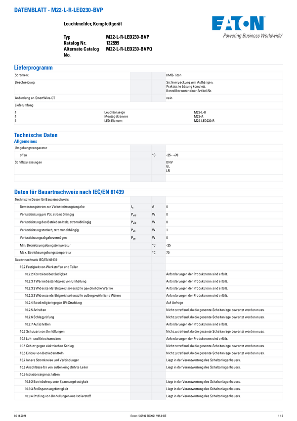 Eaton M22-L-R-LED230-BVP Lampka sygnalizacyjna 1 szt.