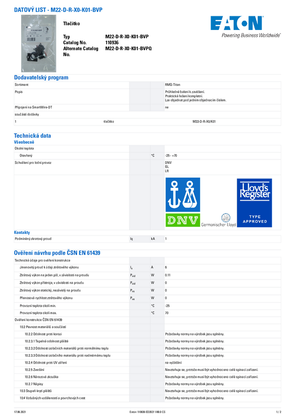 Eaton 110936 M22-D-R-X0-K01-BVP Przycisk pierścień przedni z tworzywa sztucznego 1 szt.