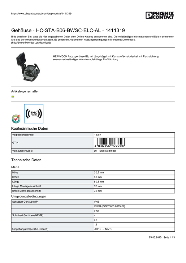 Phoenix Contact HC-STA-B06-BWSC-ELC-AL 1411319 Phoenix Contact HC-STA-B06-BWSC-ELC-AL 1411319 Obudowa do złącza przemysł