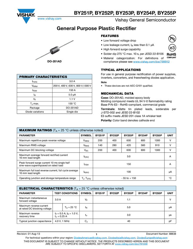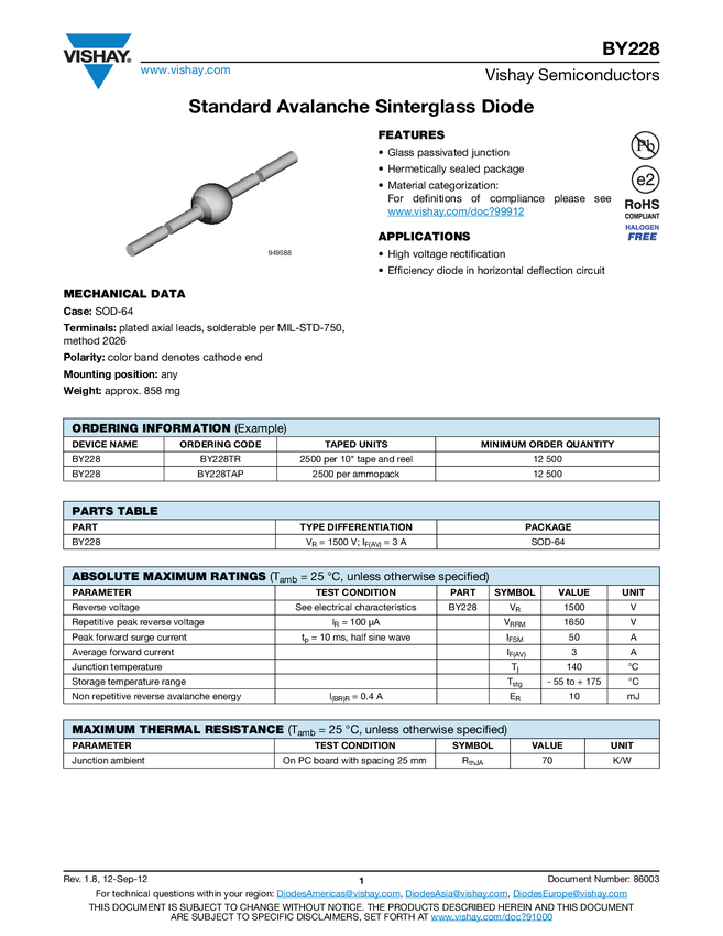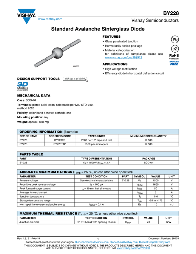 Dioda; prostownicza; BY228TAP; 3A; 1500V; SOD64; THT; VISHAY; RoHS