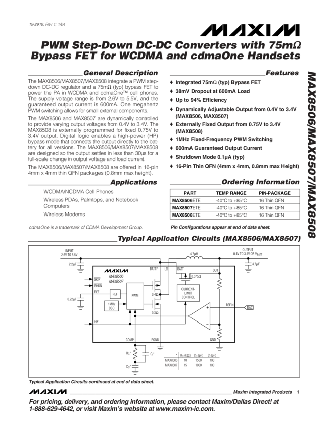 MAX8506, MAX8507, MAX8508 PWM Step-Down DC-DC Converters with 75mΩ Bypass FET for WCDMA and cdmaOne Handsets