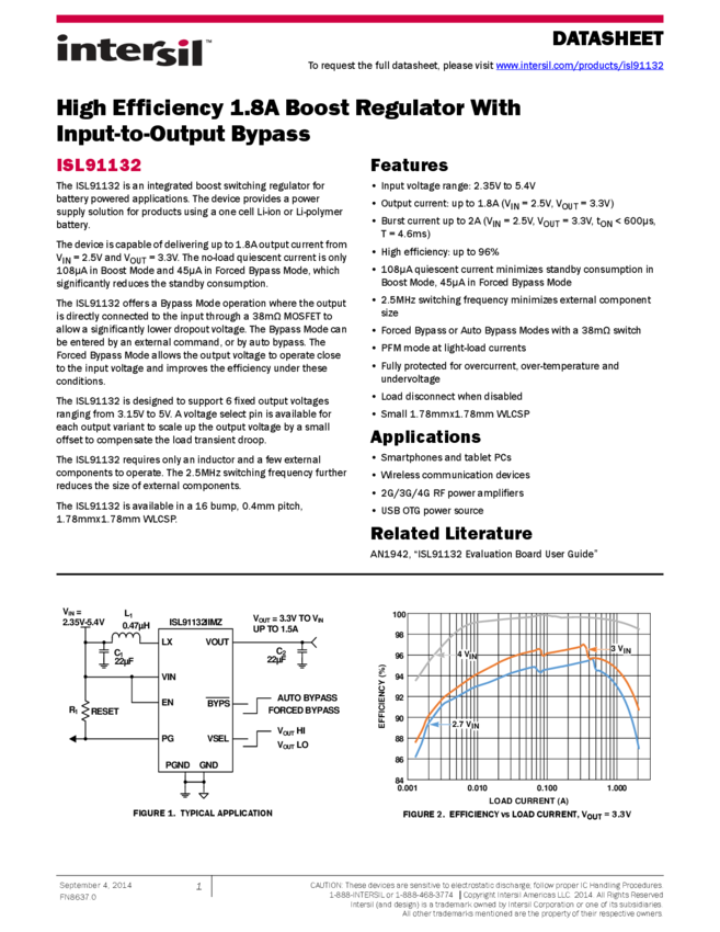 High Efficiency 1.8A Boost Regulator With Input-to-Output Bypass