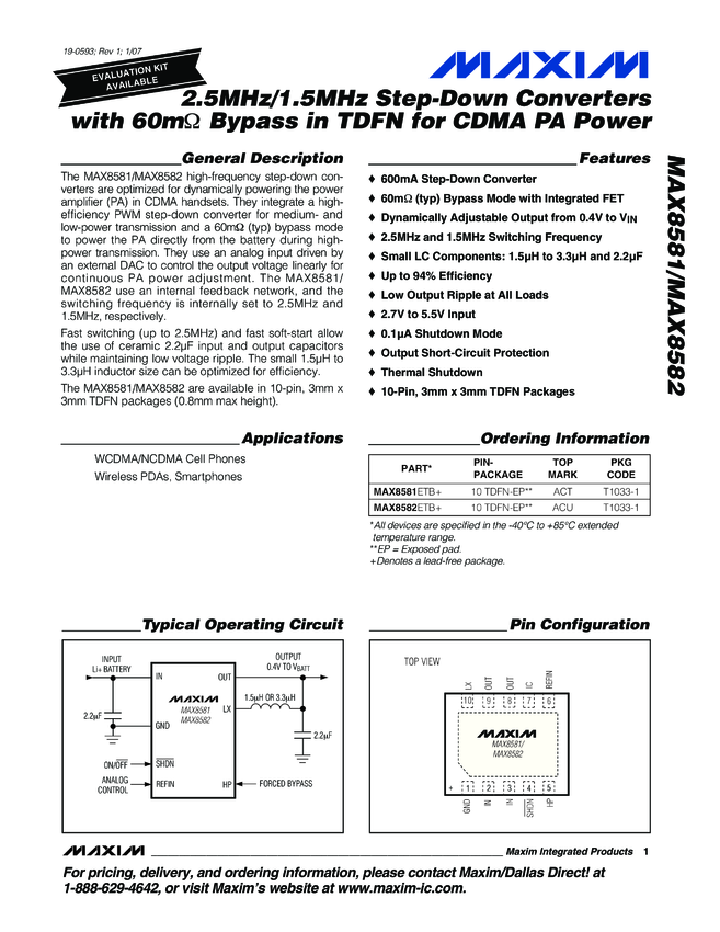 MAX8581, MAX8582 2.5MHz/1.5MHz Step-Down Converters with 60mΩ Bypass in TDFN for CDMA PA Power