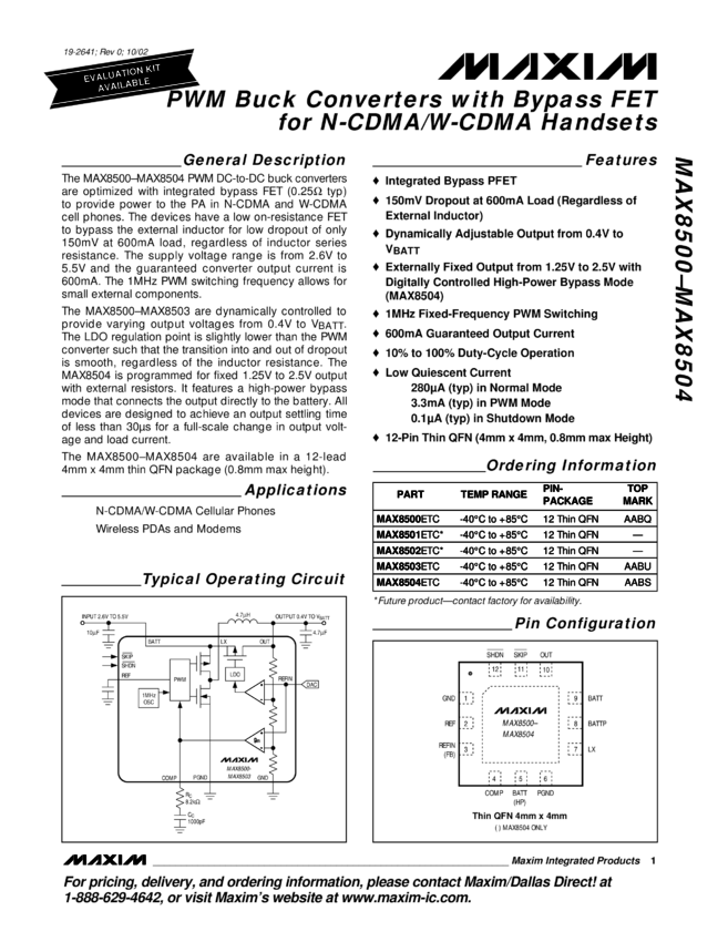 MAX8500, MAX8503, MAX8504 PWM Buck Converters with Bypass FET for N-CDMA/W-CDMA Handsets