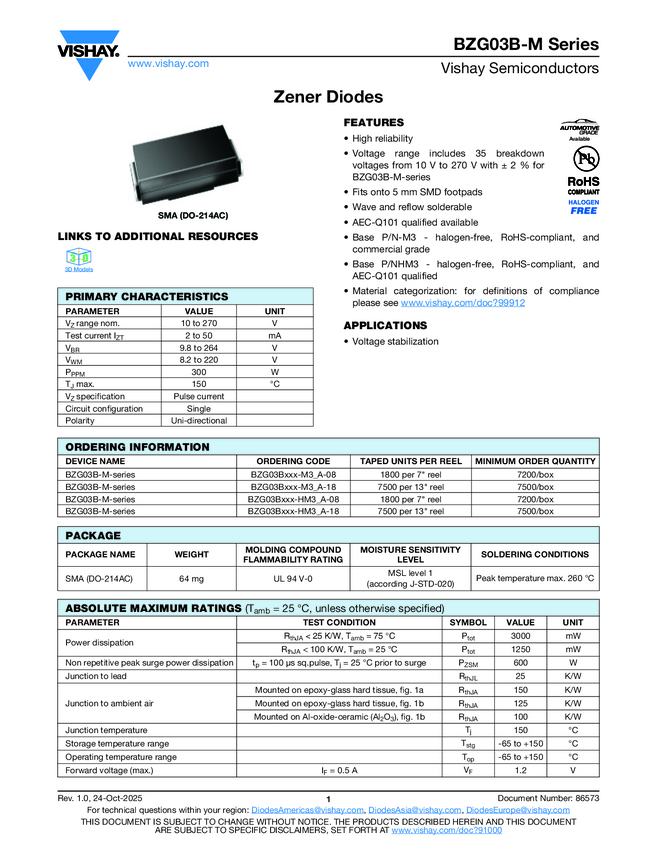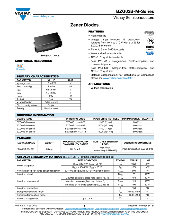 Diode Zener Single 30V 7% 3W 2-Pin SMA T/R