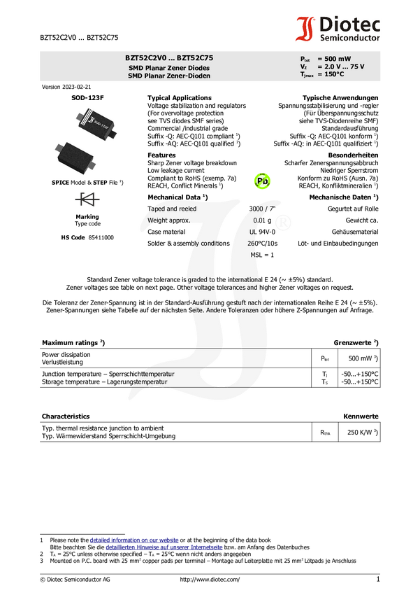 Diotec Dioda Zenera BZT52C10 Typ obudowy półprzewodnika SOD-123F Napięcie Zenera 10 V Moc (maks) P(TOT) 0.5 W Odwrócone