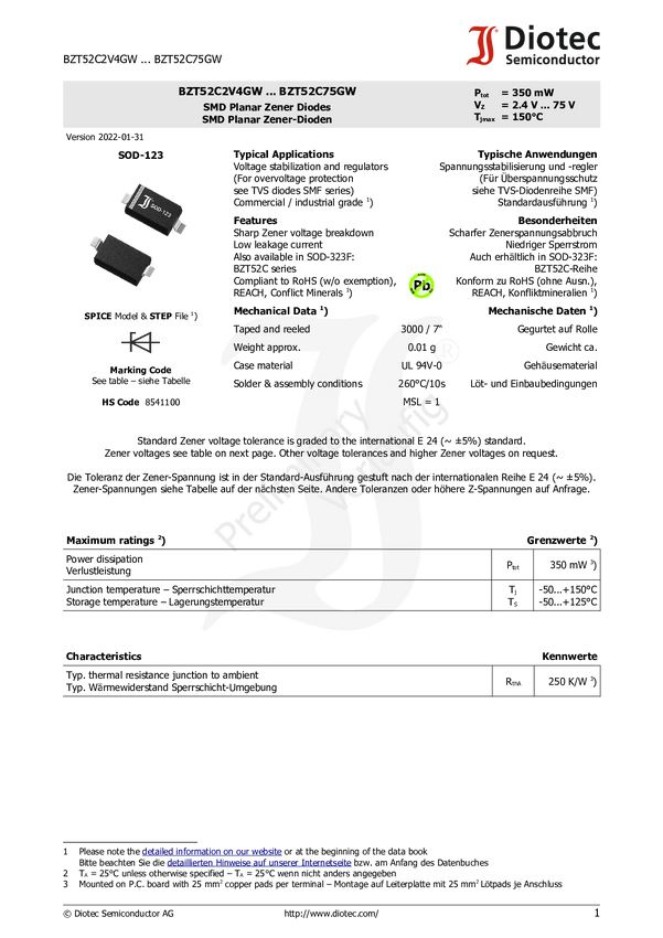 Diotec Dioda Zenera BZT52C20GW Typ obudowy półprzewodnika SOD-123 Napięcie Zenera 20 V Moc (maks) P(TOT) 0.35 W Odwrócon