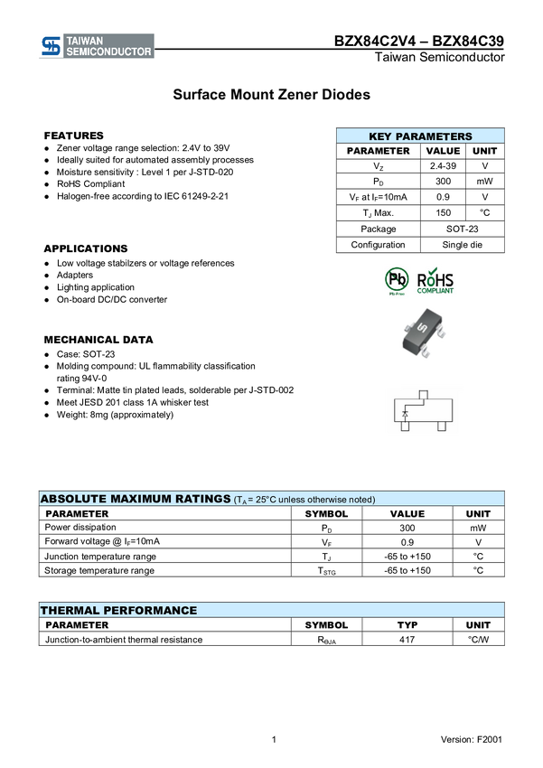 Taiwan Semiconductor Dioda Zenera BZX84C5V1 RFG Typ obudowy półprzewodnika SOT-23 taśma na dużej rolce