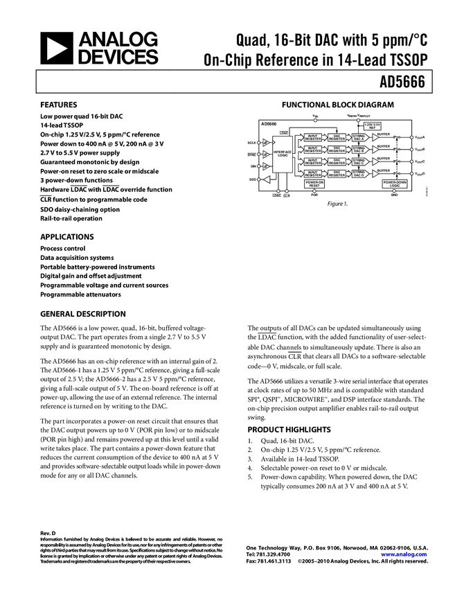 AD5666: Quad, 16 Bit D/A Converter with 10/°C Max On-Chip Reference in 14-Lead TSSOP