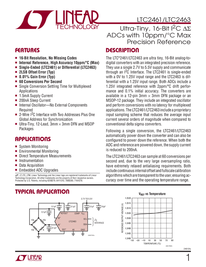 Selectable 250sps/1ksps, 16-Bit I2C Delta Sigma ADCs with 10ppm/°C Max Precision Reference