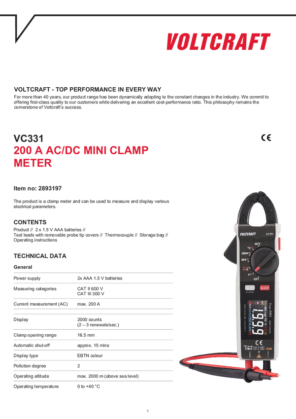 Miernik cęgowy VOLTCRAFT VC-331 VC-14465985-DakkS, CAT II 600 V, CAT III 300 V, AC/DC, kalibracja DAkkS
