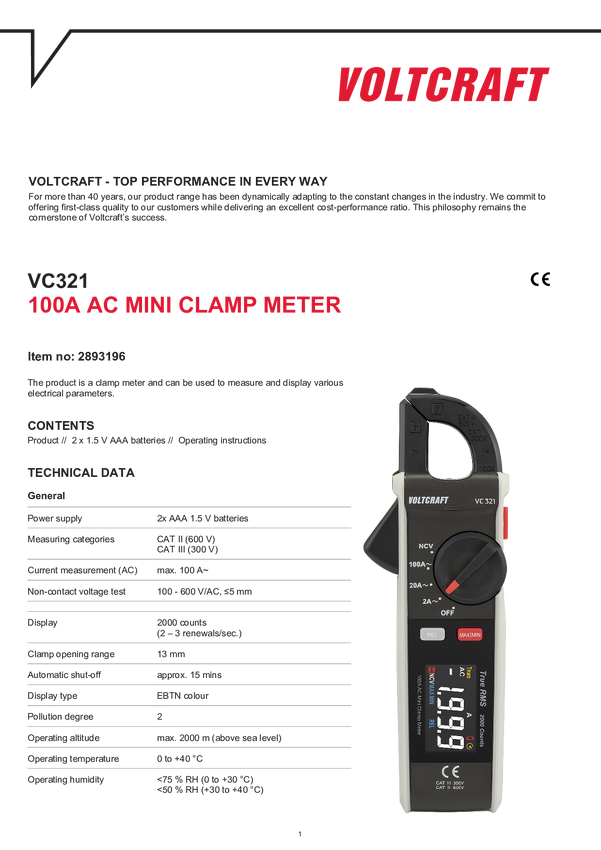 Miernik cęgowy VOLTCRAFT VC-321 VC-14465980-DakkS, CAT II 600 V, CAT III 300 V, kalibracja DAkkS