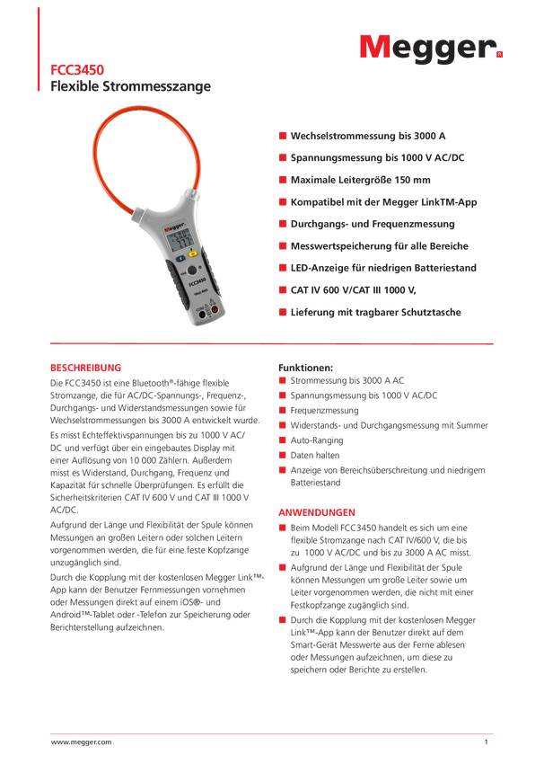 Miernik cęgowy cyfrowy Megger FCC3450 1013-833, CAT III 1000 V, CAT IV 600 V, AC/DC, kalibracja fabryczna (bez certyfika
