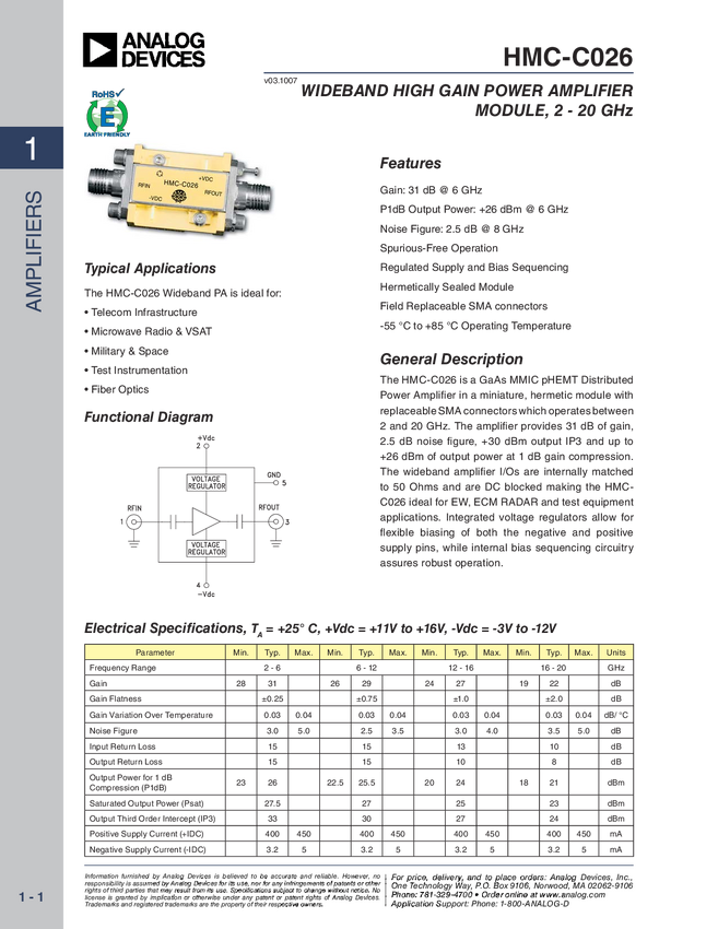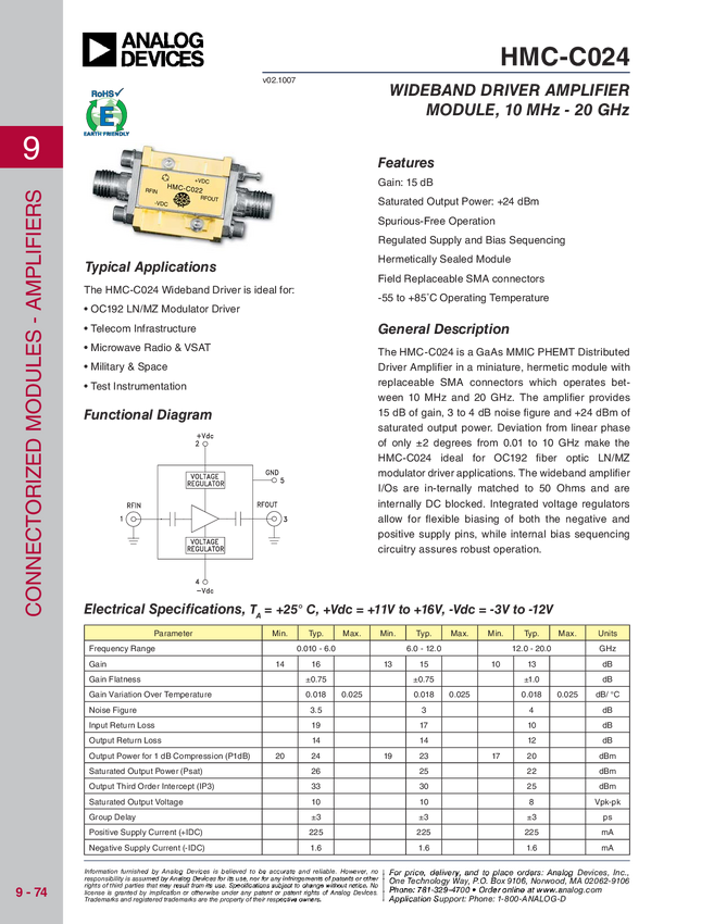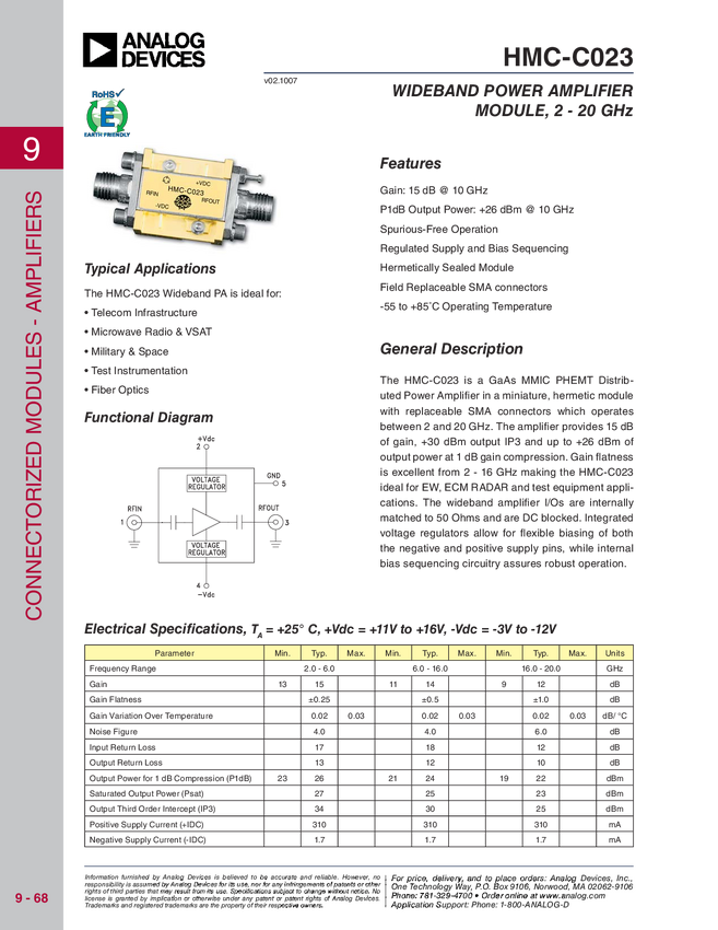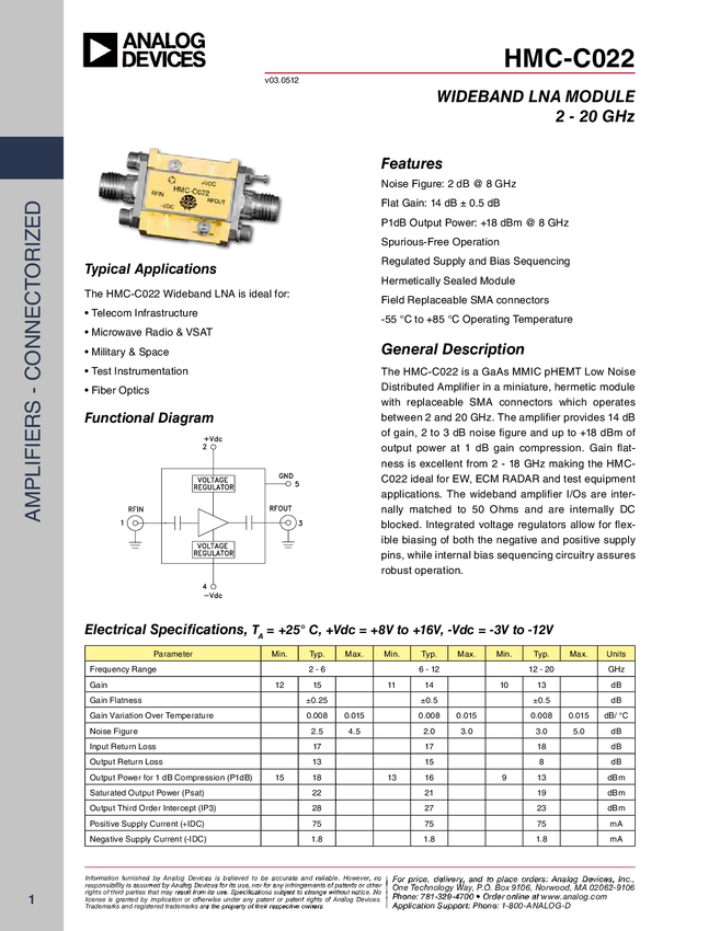 Wideband Low Noise Amplifier Module, 2 - 20 GHz