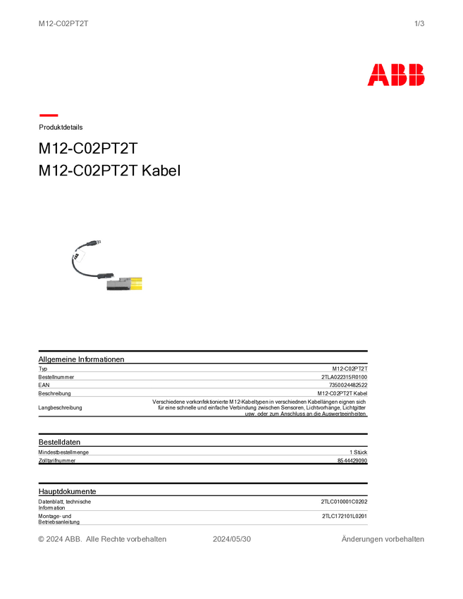 ABB 2TLA022315R0300 Złącze czujnika/aktuatora M12-C02PT62RM, 1 szt.