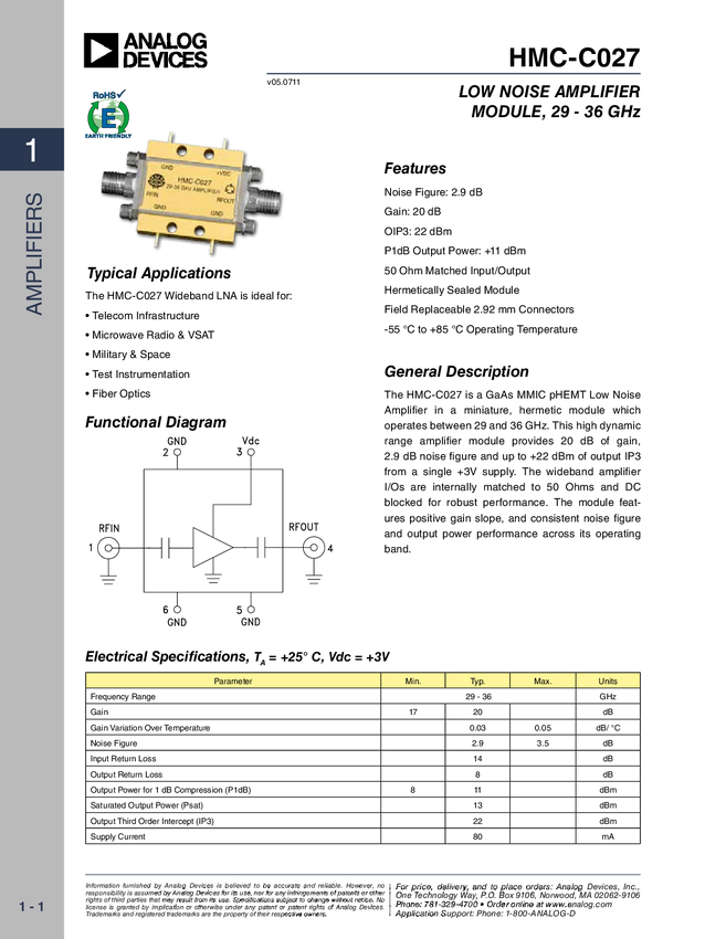 Wideband Low Noise Amplifier Module, 29 - 36 GHz