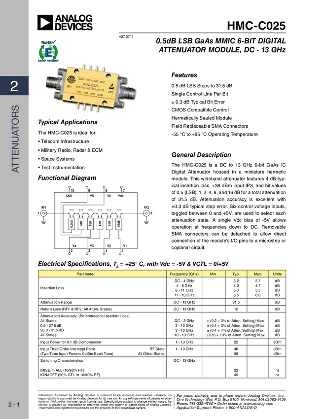 0.5dB LSB 6-Bit Digital Attenuator Module, DC - 13 GHz