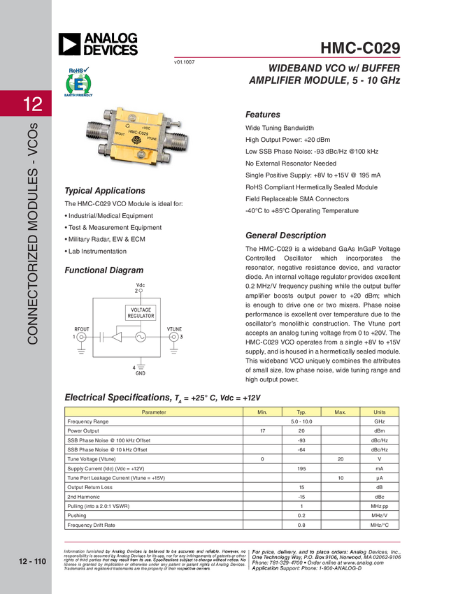 Wideband VCO w/Buffer Amplifier Module, 5 - 10 GHz