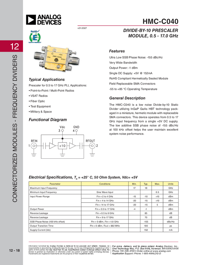 InGaP HBT Divide-by-10 Module, 0.5 - 17.0 GHz