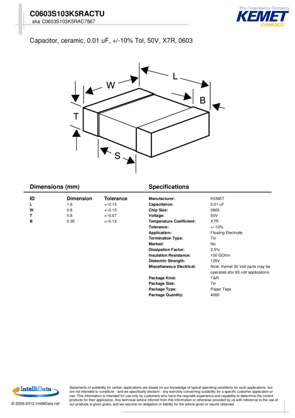 Cap Ceramic 0.01uF 50V X7R 10% SMD 0603 125°C Paper T/R