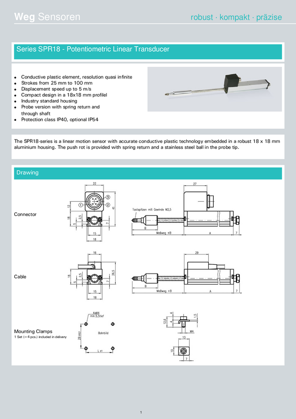 Czujnik położenia, przewodzący plastyk, z ośką od frontu i od tyłu; pomiar (travel) 150mm; wym.: 188x18(22)x18(41)mm; liniowość<0,5%; moc>0,5W; złącze c09131d0 051002 - 5 pin; trwałośc 20 mil.cykli; rezystancja 5 kohm
