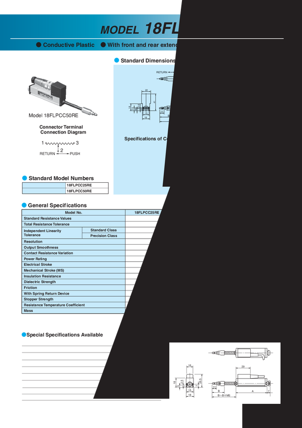 Czujnik położenia przewodzący plastyk, z ośką od frontu; pom iar (travel) 75(80)mm; wym 113x18(22)x18(41)mm; lin. 0,5%; moc 0,5W; sprężyna powrotna; złącze C09131d0051002-5pin;trw. 20mil cykli; rez.5kohm; oznaczenie na Polskę 18FLPCC75RE-..