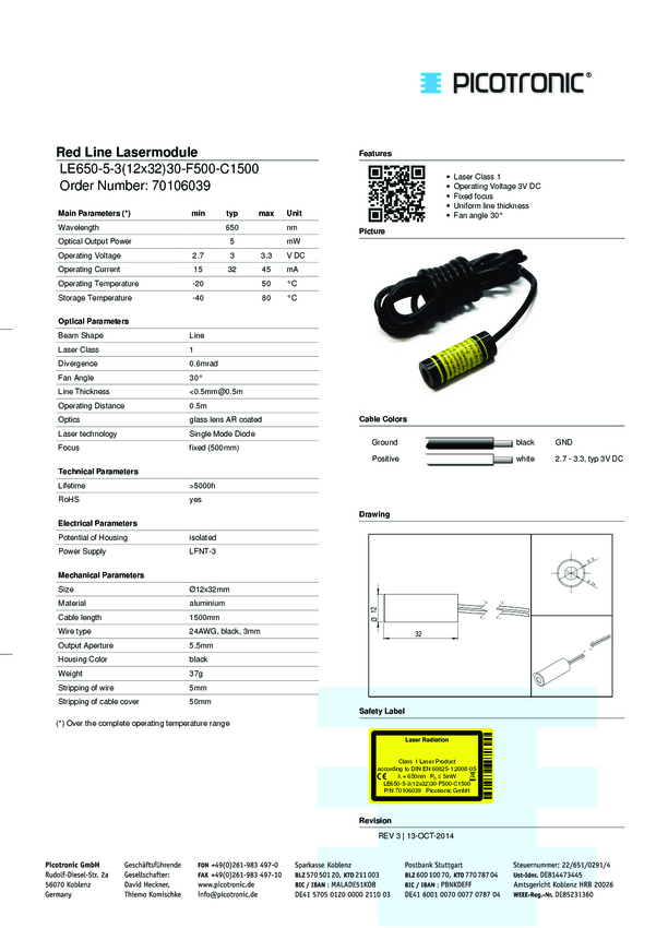 Picotronic 70106039 Moduł laserowy LE650-5-3(12x32)30-F500-C1500, klasa 1, 5 mW, 650 nm